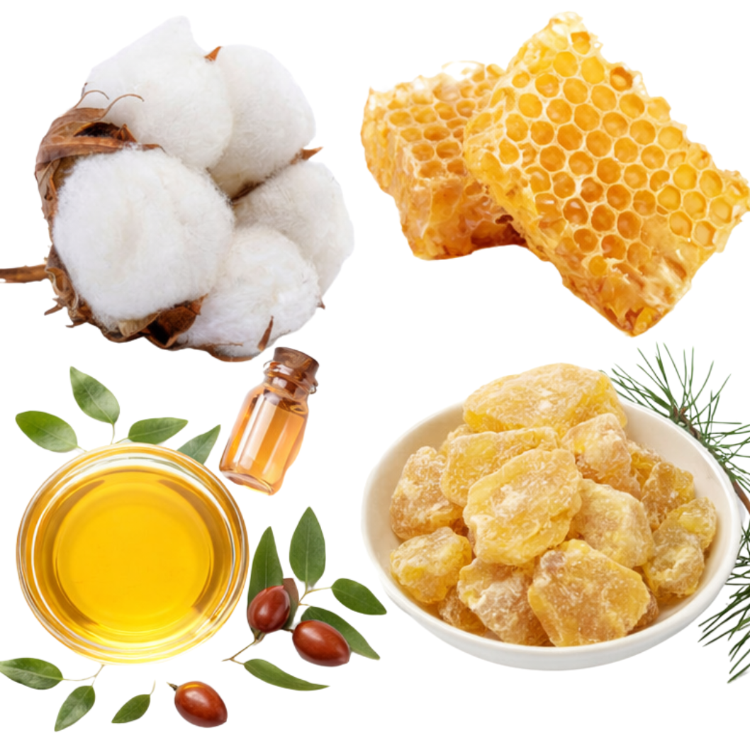 100% Cotton Material, Beeswax, Jojoba Oil, Pine Resin.